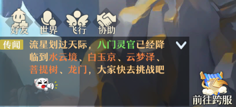 四、优化内容 1、 新增前往跨服入口,常驻于主界面下方位置,仙友们日后可更便捷地前往跨服环境组队挑战完成任务。 2、优化了宠物技能神佑的技能描述,使其更准确。 3、移除了部分小额减伤buff的buff特效,避免战斗中特效过多。 4、优化了神器背包已满时的提示。