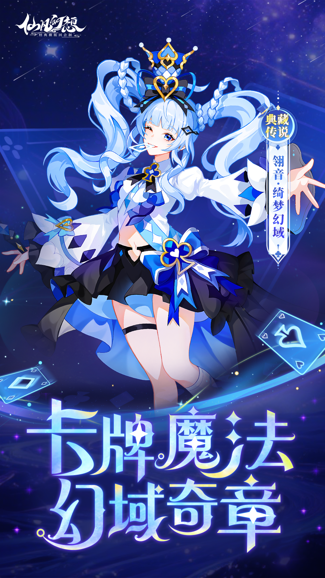 翎音的形象也迎来全新蜕变:蓝色双马尾多了几分俏皮,与蓝白礼服搭配,百变魔法师的气质尽显;身旁纷飞的卡牌,在法杖的控制下在虚实交错的戏法中,将魔法的灵动显示得淋漓尽致~